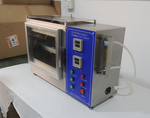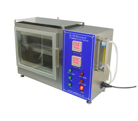O instrumento consiste em duas porções: a caixa de controle e a caixa da combustão. A amostra é apertada horizontalmente pela braçadeira e colocada no suporte da caixa da combustão. A chama é inflamada pela caixa de controle por algum tempo, e a chama é extinguida. Observe a propagação da chama da amostra, meça o tempo onde toma para que a chama espalhe uma determinada distância na amostra, para calcular a velocidade da propagação da chama, e para avaliar a resistência da chama da amostra.