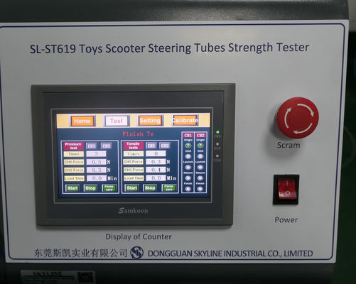 Verificador de direção da força dos tubos do "trotinette" dos brinquedos para aplicar-se para testar a força dos tubos de direção do "trotinette" do brinquedo, incluindo a resistência às forças descendentes e a resistência às forças ascendentes.